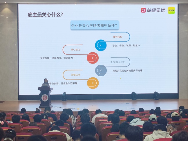 沈雪琴围绕确定求职策略、把握校招黄金期、做好充足准备、重视进度管理、规避求职风险五大模块展开分享,结合行业数据与典型案例系统解析校招全周期关键环节:重点对比秋招(岗位占比超70%)与春招(补录核心期)特点,强调提前3-6个月关注企业招聘信息;提出“自我认知—行业探索—目标设定—行动规划—动态评估”五步法求职策略模型,现场指导学生绘制“个人竞争力雷达图”;针对简历造假、薪资陷阱等高频问题,结合《劳动合同法》要点进行案例警示。她还以产业运营、业务拓展等岗位为例,拆解传统岗位(需专业证书+实习履历+数据分析能力)与新兴赛道(需数字化工具应用+跨学科思维+行业敏感度)的核心能力要求,建议学生建立“企业清单”按梯度跟进,并利用校友网络拓宽信息渠道。
