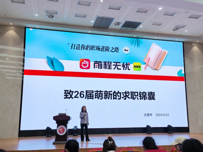 讲座尾声,沈雪琴以“主动出击、保持韧性、拥抱变化”激励学生,指出“求职是自我认知的延伸,每一次面试都是职业认知的升级”,并在互动环节就“跨专业求职壁垒”“实习与秋招时间冲突”等问题给予个性化建议。
