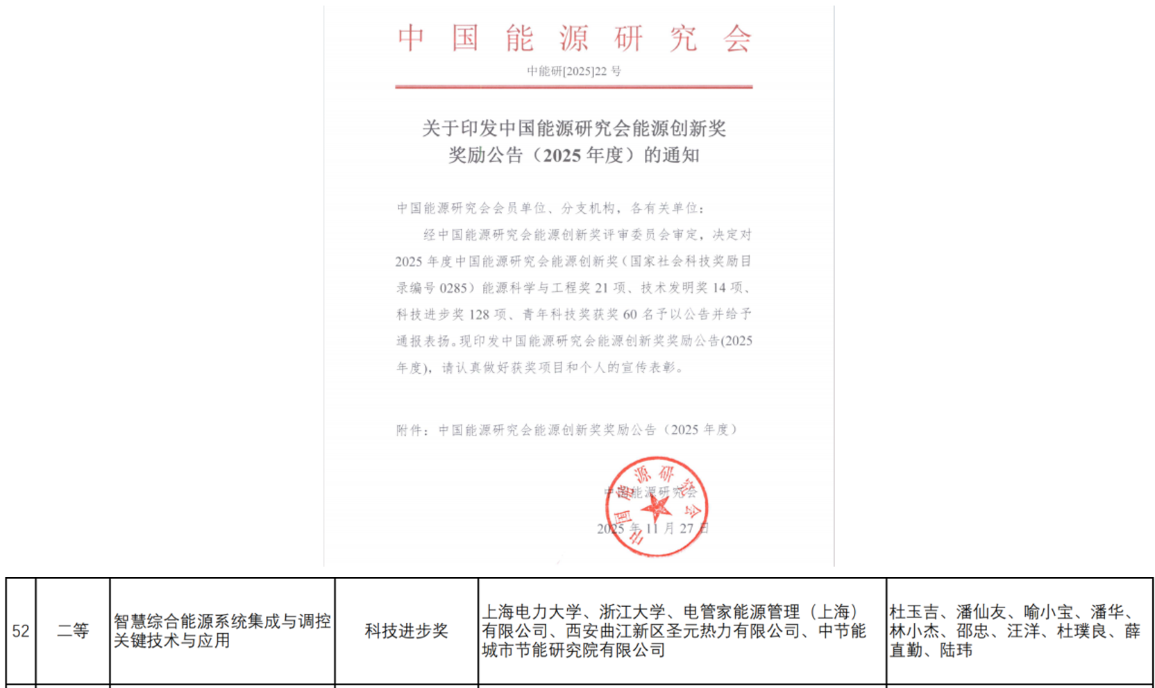 近日,中国能源研究会正式印发了中国能源研究会能源创新奖奖励公告(2025年度),我院牵头的《智慧综合能源系统集成与调控关键技术与应用》项目喜获科技进步二等奖,该成果由我院多位教师联合浙江大学、电管家能源管理(上海)有限公司等单位共同完成。